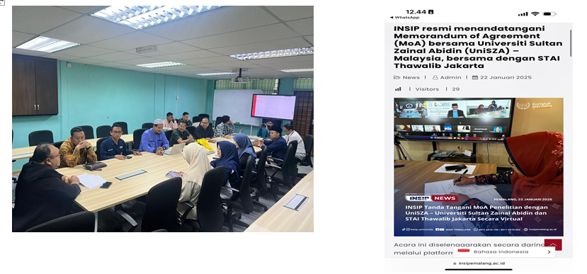 Pemalang, 29 September 2024 – Institut Agama Islam Pemalang (INSIP) resmi menjalin kerja sama internasional dengan Universiti Sultan Zainal Abidin (Unisza). Penandatanganan Nota Kesepahaman dilaksanakan pada Kamis, 10 Juli 2025, di Unisza.