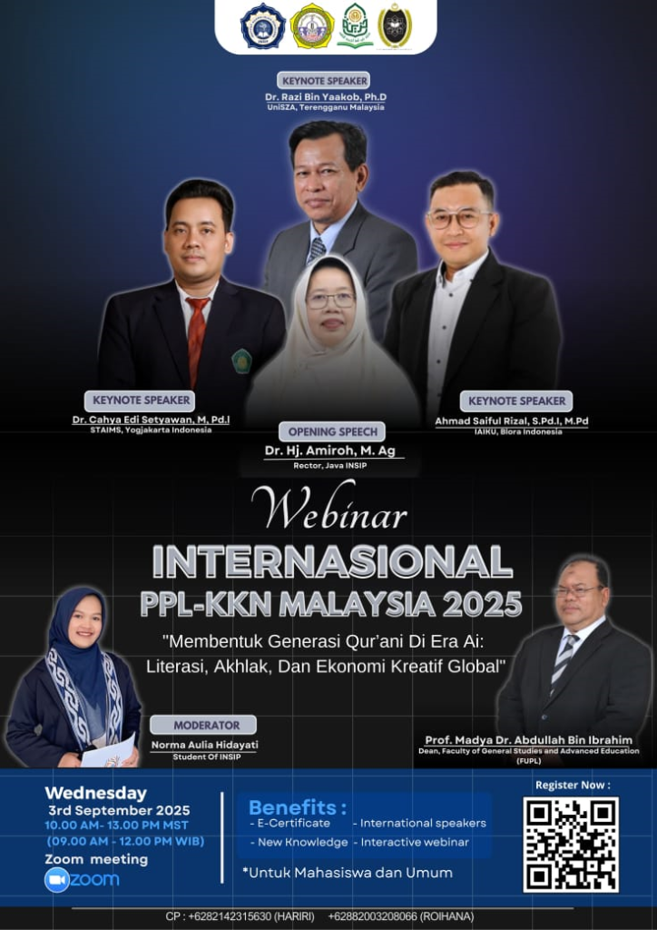 Institut Agama Islam Pemalang (INSIP) melalui LPPM INSIP melaksanakan PPL-KKN Internasional kembali menunjukkan komitmennya dalam meningkatkan kualitas pendidikan dan pengembangan sumber daya manusia melalui kegiatan Webinar Internasional PPL-KKN Malaysia 2025. Webinar yang digelar pada Rabu, 3 September 2025, ini mengangkat tema “Membentuk Generasi Qur’ani di Era AI: Literasi, Akhlak, dan Ekonomi Kreatif Global”.