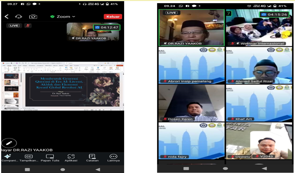 Webinar ini menghadirkan tiga pembicara utama yang berkompeten di bidangnya, yaitu: 1. Dr. Razi Bin Yaakob (UniSZA, Terengganu Malaysia) dengan materi “Integrasi Teknologi AI dalam Pendidikan Islam: Peluang dan Tantangan” 2. Dr. Cahya Edi Setyawan, M.Pd.I (STAIMS, Yogyakarta Indonesia) dengan materi “Literasi Digital dan Akhlak dalam Era AI: Perspektif Pendidikan Islam” 3. Ahmad Saiful Rizal, S.Pd.I, M.Pd (IAIKU, Blora Indonesia) dengan materi “Ekonomi Kreatif Global dalam Perspektif Islam: Peluang dan Tantangan bagi Generasi Qur’ani”