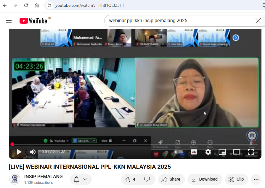 Webinar Internasional PPL-KKN Malaysia 2025 berjalan sukses dan lancar. Kegiatan ini dapat memberikan pengetahuan dan wawasan yang bermanfaat bagi peserta tentang pentingnya literasi, akhlak, dan ekonomi kreatif global dalam membentuk generasi Qur’ani di era AI. INSIP Pemalang berkomitmen untuk terus meningkatkan kualitas pendidikan dan pengembangan sumber daya manusia melalui kegiatan-kegiatan seperti ini.