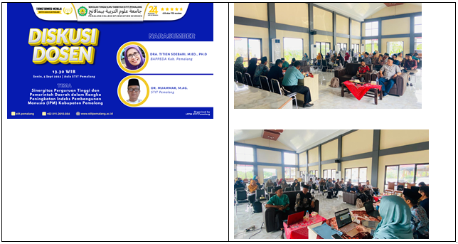 Pada tanggal 5 September 2022, Lembaga Penelitian dan Pengabdian Masyarakat (LPPM) STIT Pemalang saat ini men jadi INSIP Pemalang menyelenggarakan diskusi dosen dengan tema “Sinergi Perguruan Tinggi dan Pemerintah Daerah dalam Rangka Peningkatan Indeks Pembangunan Manusia (IPM) Kabupaten Pemalang”. Diskusi ini menghadirkan dua narasumber utama, yaitu Dra. Titen Soebari, Ph.D dan Dr. Muammar, M.A, serta diikuti oleh 25 dosen dari berbagai prodi, termasuk PAI, PBA, MPI, PIAUD, dan PGMI.