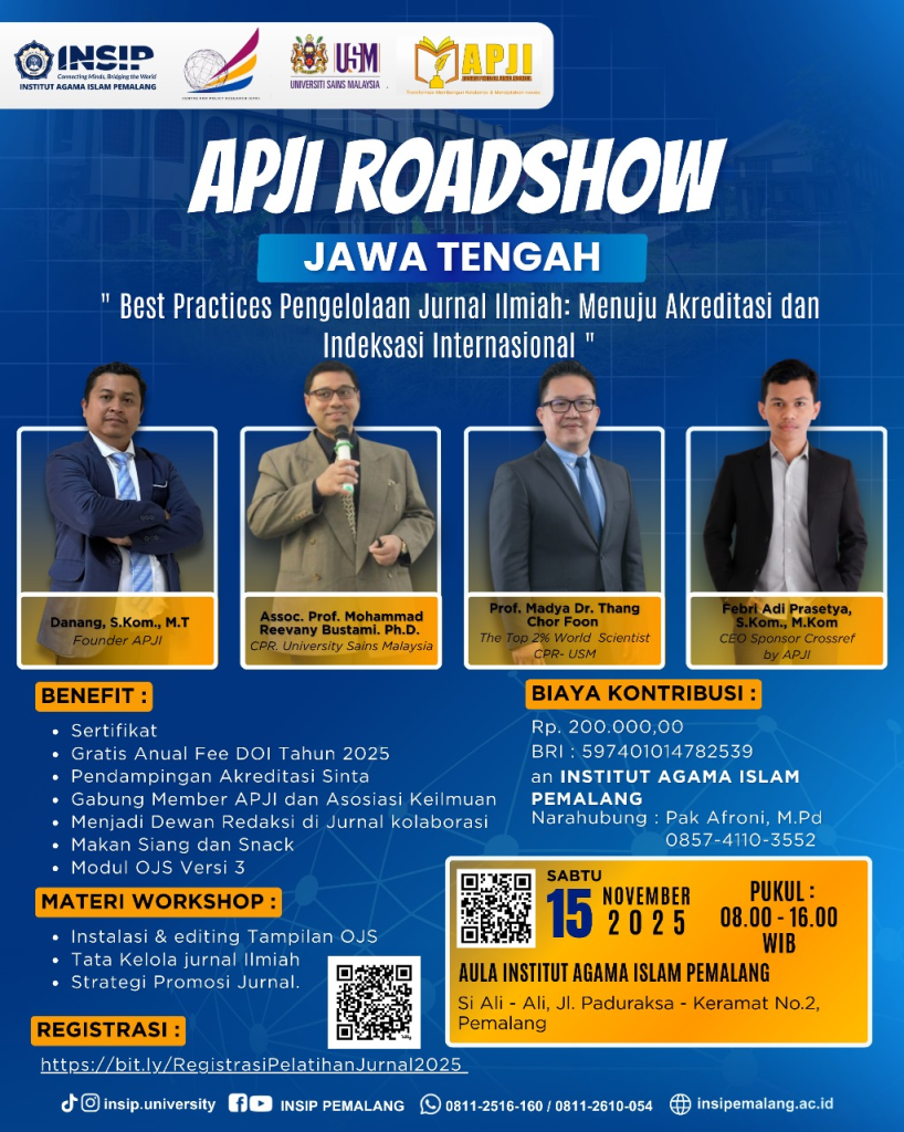Institut Agama Islam Pemalang dengan bangga mengundang para pengelola jurnal, dosen, peneliti, dan akademisi untuk mengikuti Pelatihan & Workshop Jurnal Ilmiah yang akan mengulas: